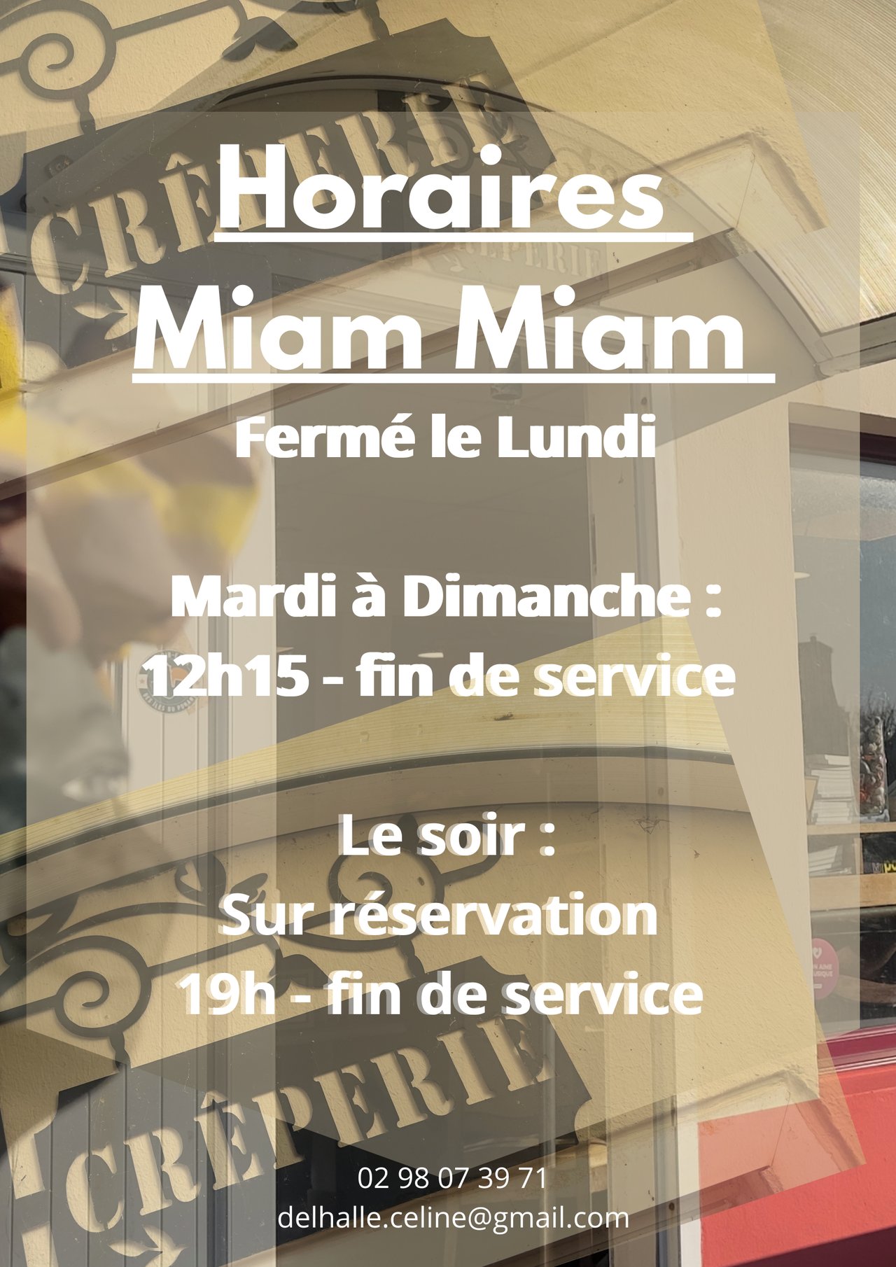 Horaires : Lundi : Fermé Mardi à Samedi : 12h30 - fin de service le soir sur réservation le soir sur réservation le soir sur réservation le soir sur réservation Dimanche : 12h30 - fin de service Fermé le soir